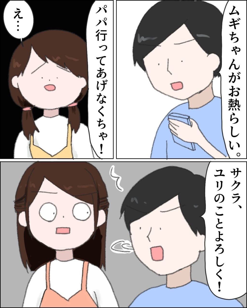 すると、「ムギちゃんがお熱らしい。パパ行ってあげなくちゃ!」夫の言葉に「え・・」と悲しそうな顔をするユリ。「サクラ、ユリのことよろしく!」夫は平然と私にそう言いました。