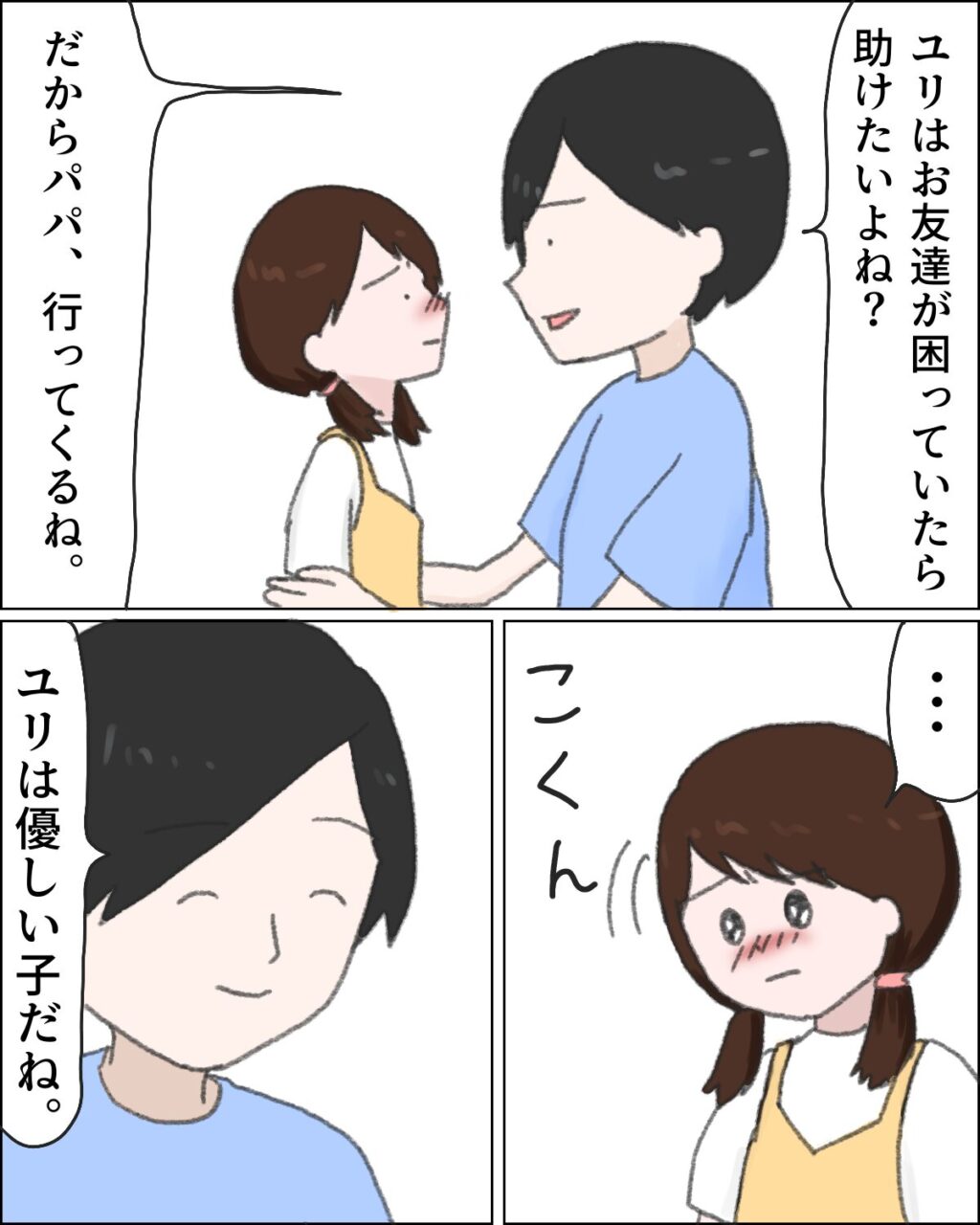 そして、「ユリはお友達が困っていたら助けたいよね?だからパパ、行ってくるね」とユリに言いました。「・・」何も言わずにこくんと頷くユリに、「ユリは優しい子だね」と夫が言いました。