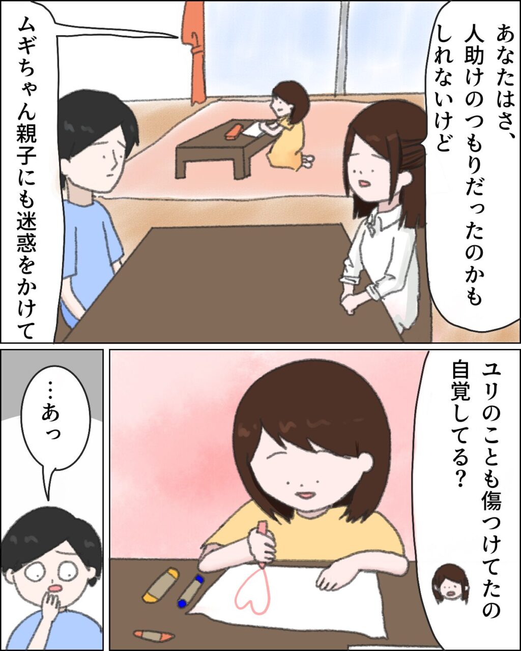 「あなたはさ、人助けのつもりだったのかもしれないけど、ムギちゃん親子にも迷惑をかけて、ユリのことも傷つけてたの自覚してる?」少し離れたところでお絵描きしているユリちゃんを見ながら、「・・あっ」夫は何か気づいたようでした。