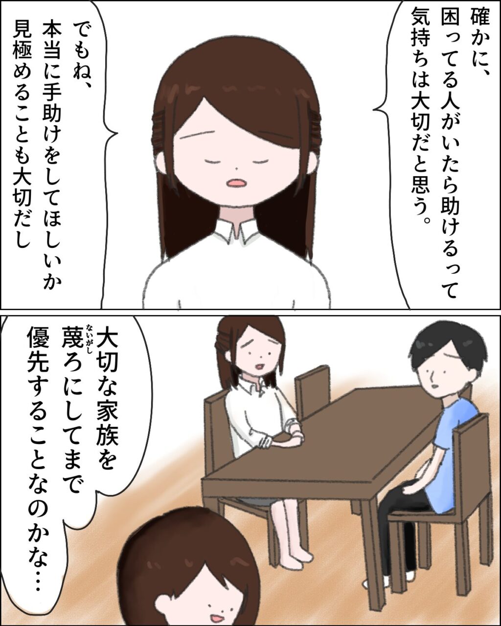 「確かに、困ってる人がいたら助けるって気持ちは大切だと思う。でもね、本当に手助けをしてほしいか見極めることも大切だし、大切な家族を蔑ろにしてまで優先することなのかな・・」