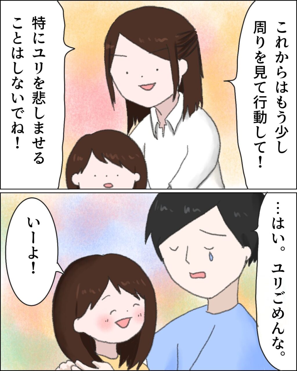 そして、「これからは、もう少し周りを見て行動して!特にユリを悲しませることはしないでね!」私がそう言うと、「・・はい。ユリごめんな」と申し訳なさそうにユリに謝る夫。ユリは「いーよ!」と笑顔で答えました。