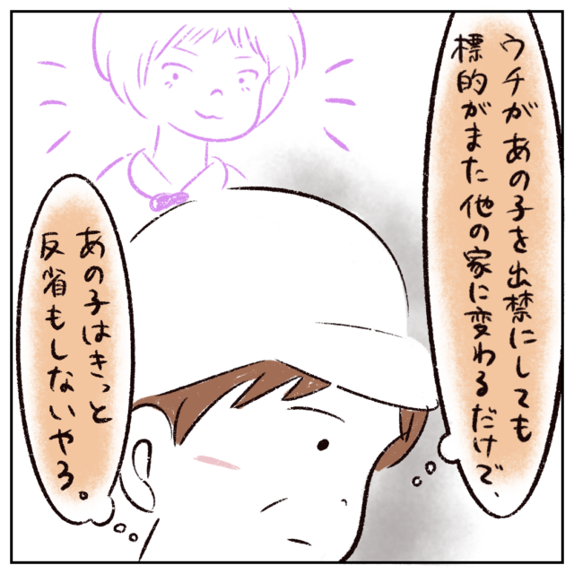 「ウチがあの子を出禁にしても標的がまた他の家に変わるだけで、あの子はきっと反省もしないやろ」さなかちゃんを出禁にするだけでは問題は解決しないと考えたまるさんのお母さん。