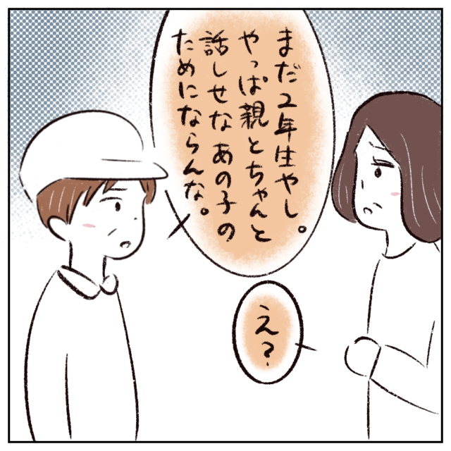「まだ2年生やし。やっぱ親とちゃんと話せなあの子のためにならんな」前田さんには話しても無駄だと言われましたが、それでもまるさんのお母さんはさなかちゃんの親と話しをすると決めました。