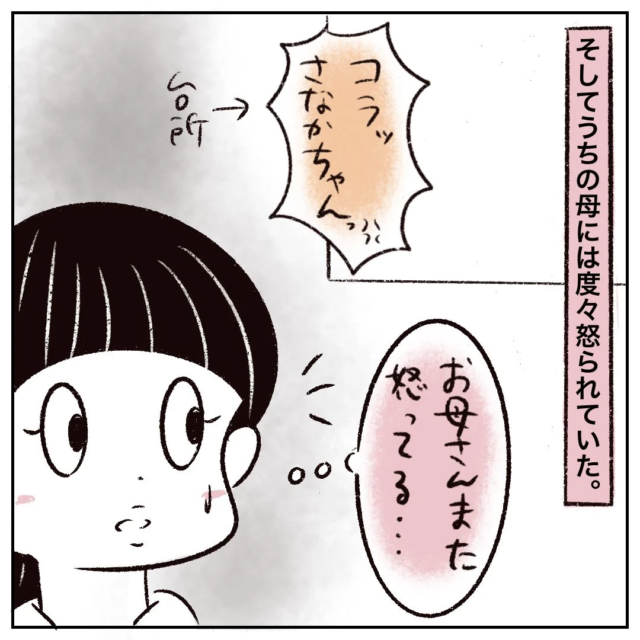 そして、まるさんの家に遊びに来たさなかちゃんは、まるさんのお母さんに度々怒られていました。台所から「コラッさなかちゃんっ」とお母さんの声が聞こえ、「お母さんまた怒ってる・・・」と、お母さんがさなかちゃんをよく叱っていることは気付いていたまるさん。