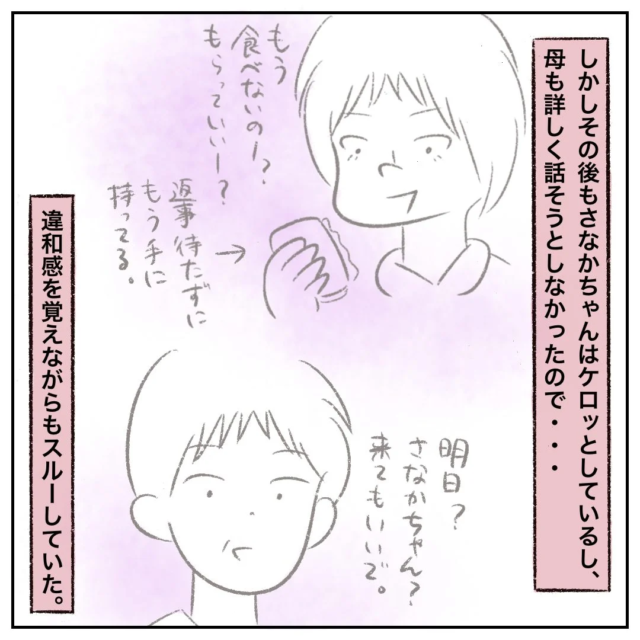 しかし、さなかちゃんは叱られたことを気にする様子もなくケロッとしており、お母さんも詳しく話すことは無かったのでまるさんは違和感を覚えながらも特に気にしていませんでした。