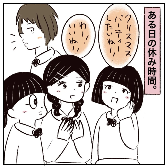 ある日の学校の休み時間。まるさんは仲良しのお友達と「クリスマスパーティーしたいねー!」「わー!いいねー!」とクリスマスパーティーの話題になりました。