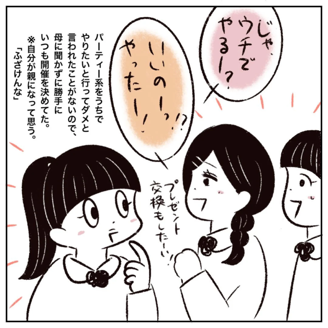 自宅でのパーティー開催をダメと言われたことがなかったまるさんが「じゃ、ウチでやるー?」と言うと「いいのーっ!?やったー!プレゼント交換もしたーい!」と盛り上がり、まるさんの家でクリスマスパーティーをすることが決まりました。