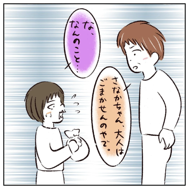 「な、なんのこと・・」指摘されてしどろもどろになりながらもとぼけるさなかちゃん、すると「さなかちゃん、大人はごまかせんのやで」お母さんは言いました。