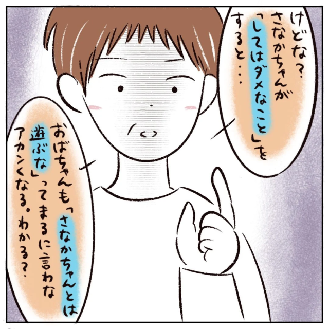 「けどな?さなかちゃんが『してはダメなこと』をすると・・おばちゃんも『さなかちゃんとは遊ぶな』ってまるに言わなアカンくなる。わかる?」