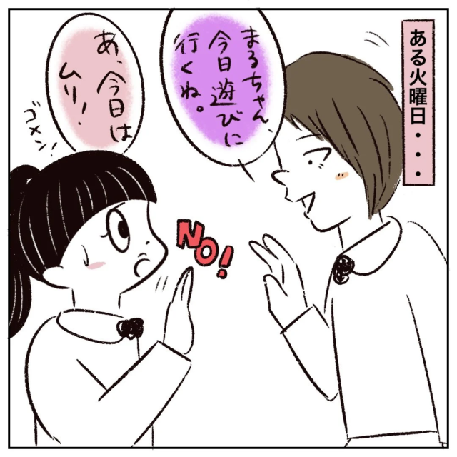 そしてある火曜日のこと。「まるちゃん、今日遊びに行くね」さなかちゃんにそう言われたまるさんは「あ、ゴメン!今日はムリ!」と断りました。