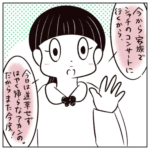 「なに言ってんの?家族で行こうってお父さんがチケット取ったの!かわりとかないから!」さすがのまるさんも怒りながらそう言うと「・・・」恨めしそうな表情で黙っているさなかちゃん。