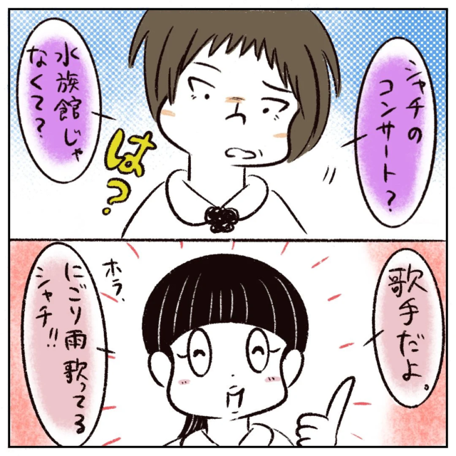 「シャチのコンサート?は?水族館じゃなくて?」と?だらけなさなかちゃんに、「歌手だよ。ほら、『にごり雨』歌ってるシャチ!!」と笑顔で説明するまるさん。