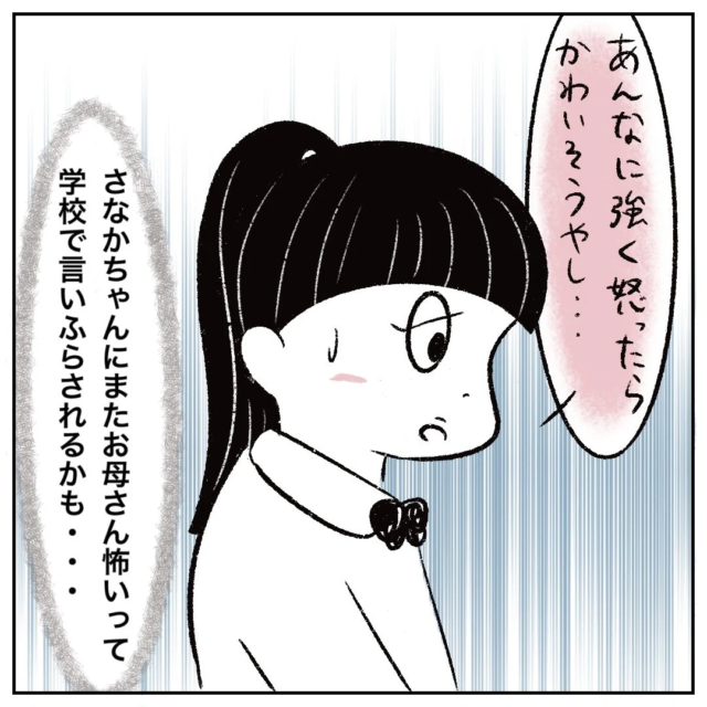 「あんなに強く怒ったらかわいそうやし・・・」とさなかちゃんに同情しながら、心の中では「さなかちゃんにまたお母さん怖いって学校で言いふらされるかも・・・」という心配もしていました。