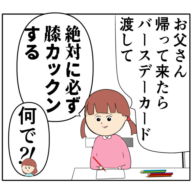 その頃、家では娘のあかりちゃんがお父さんの帰りを待ちわびていました。「お父さん帰ってきたらバースデーカード渡して、絶対に必ず膝カックンする」