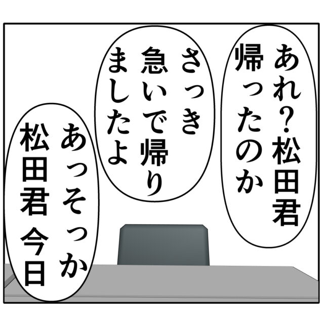 あかりちゃんがお父さんのことを考えている頃、ろみ緒さんはいつもより早く会社を出ていました。会社では同僚たちが「あれ?松田君帰ったのか?」「さっき急いで帰りましたよ」「あっそっか。松田君、今日」