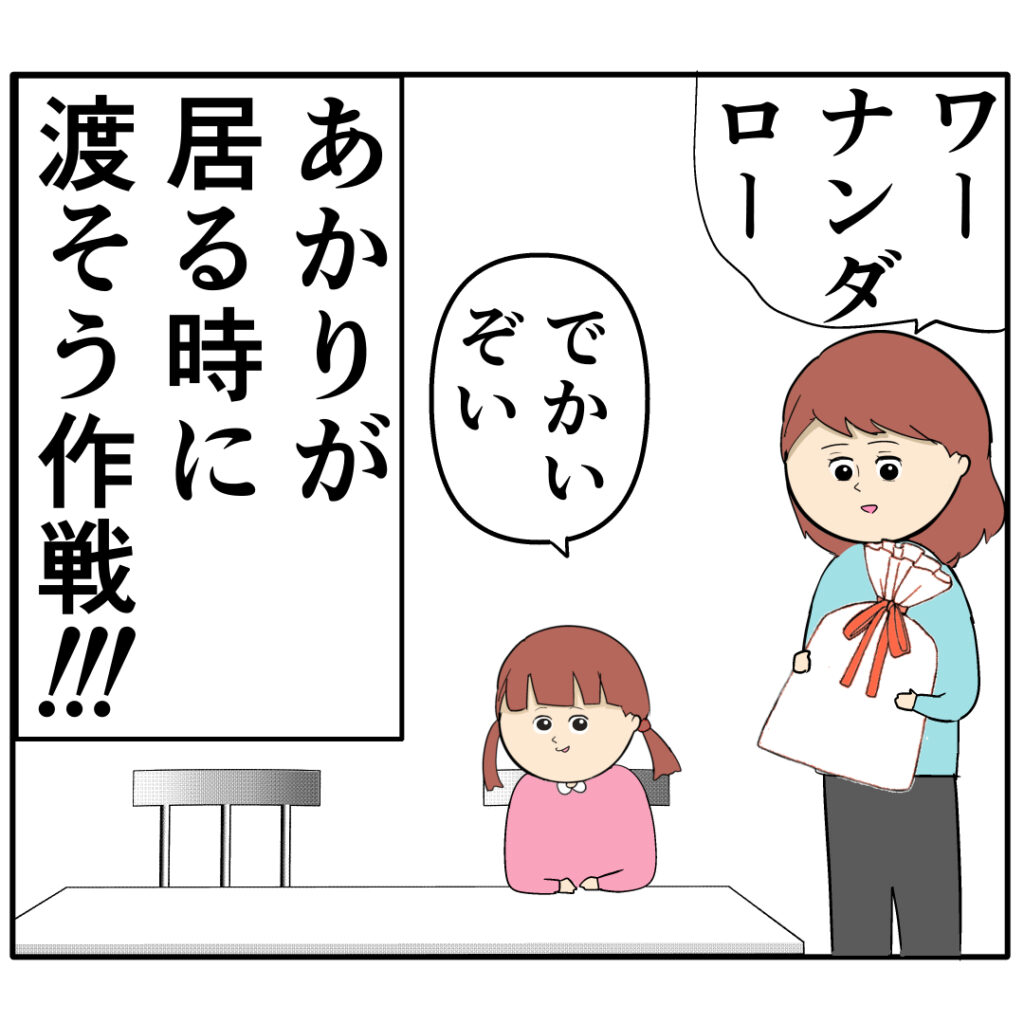 あかりちゃんが一緒に居る時に渡す作戦にしました。ろみ緒さんからプレゼントを受け取っためいさんは「ワーナンダロー」と棒読みで嬉しそうなフリをしました。