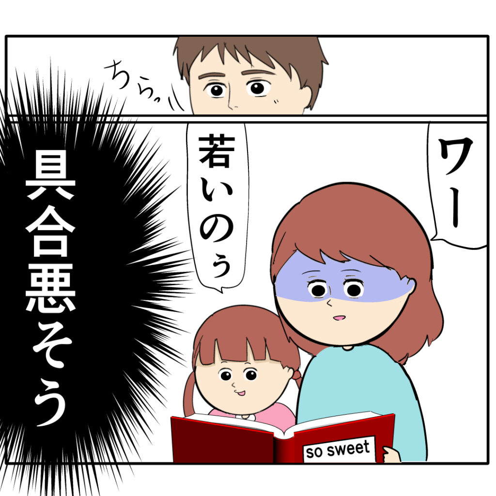 チラッとめいさん達を見ると、あかりちゃんはアルバムを見て「若いのぅ」と両親の若い頃の姿を見られて楽しそうですが、隣のめいさんは青ざめながら引きつった笑みを浮かべていて「具合悪そう」と驚くろみ緒さん。