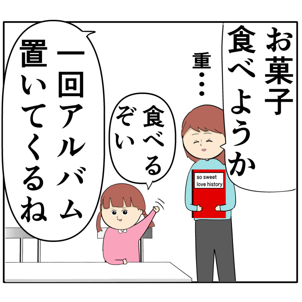 ろみ緒さんの手作りアルバムを見ていたら気分が悪くなってしまっためいさんは、「お菓子食べようか。一回アルバム置いてくるね」とあかりちゃんに言って何とかアルバムを視界から消し去りたい様子です。