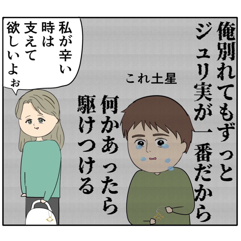 ジュリ実さんは土星のチャームをバッグにつけ、別れる時に「俺別れてもずっとジュリ実が一番だから。何かあったら駆けつける」と言ってチャームを渡してくれたろみ緒さんのことを思い出しながら「私が辛い時は支えて欲しいよぉ」と呟きます。