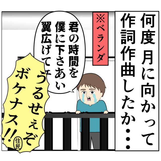 「何度月に向かって作詞作曲したか・・・」ジュリ実さんの両親に結婚を反対されて別れた後、ベランダでジュリ実さんへの想いを泣きながら歌にしては住民から「うるせぇぞボケナス!!」と苦情を入れられていたろみ緒さん。