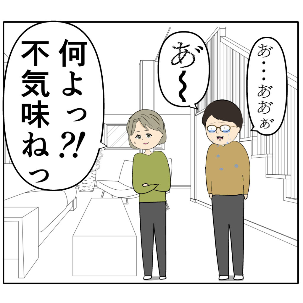 妻のジュリ実さんが子どもの頃から母親にどれほど酷い扱いを受けてきたのかを知って涙が止まらず「あ・・ああぁ、あ~~」と声にならない声で泣きながら立ち尽くすめが根さんを見て、ジュリ実さんの母親は「何よっ?!不気味ねっ」と迷惑そうに言いました。