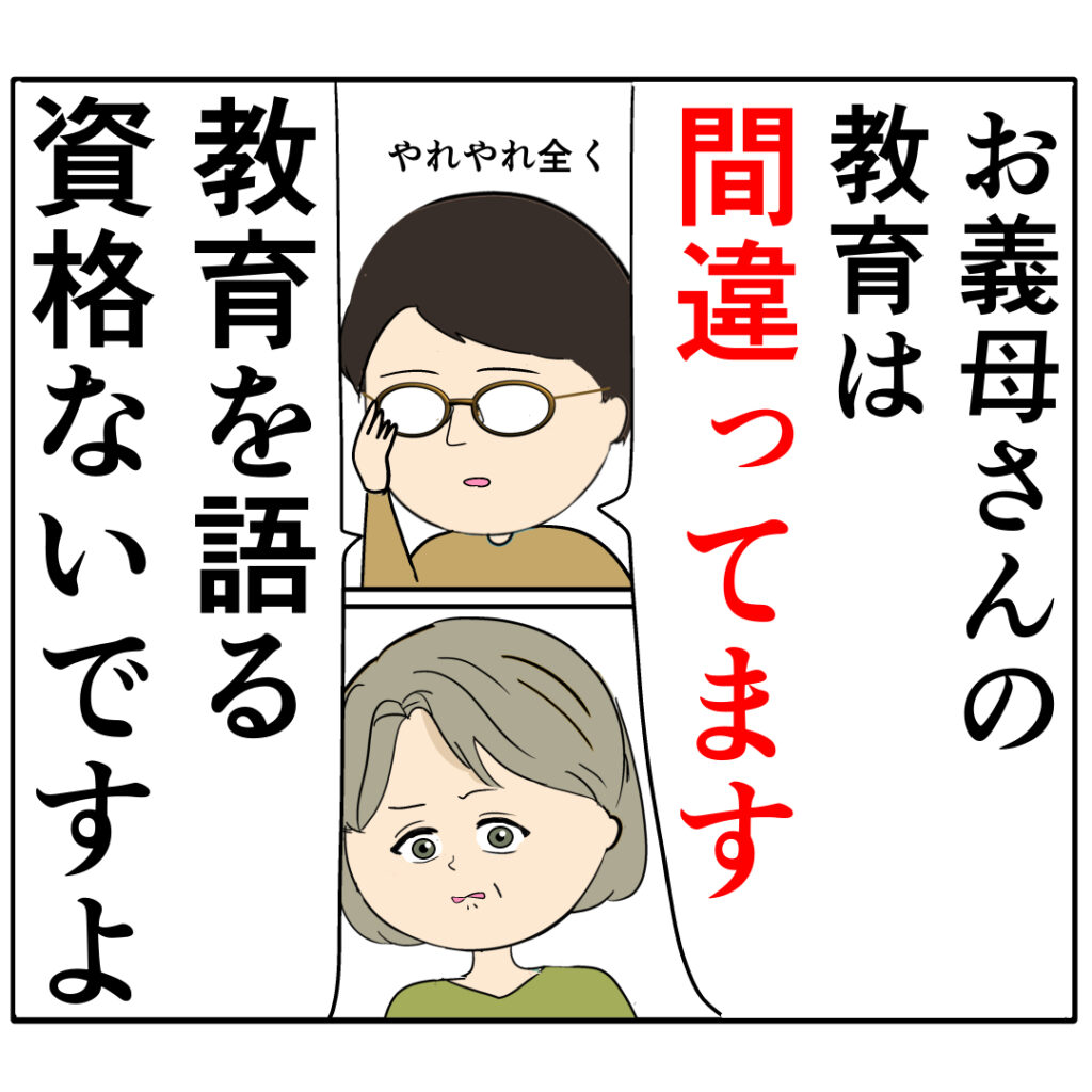 めが根さんは「お義母さんの教育は間違ってます。教育を語る資格ないですよ」と義母の教育論をばっさり切り捨てました。自分の考えを否定された義母は信じられないといった感じで顔を引きつらせます。