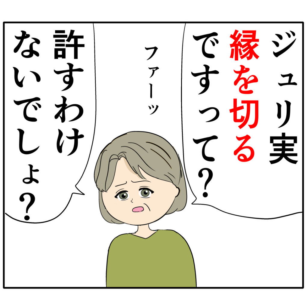 テストの点数が悪いとジュリ実さんを公園に置き去りにするなどの教育虐待をしていた母親は、ジュリ実さんから縁を切られた後に待ち伏せをして会いに来ました。「ジュリ実、縁を切るですって?許すわけないでしょ?」と怒り心頭の母親。