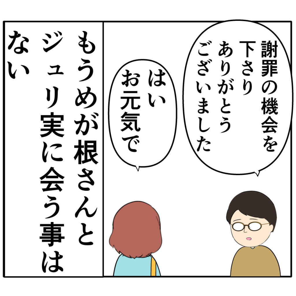 「謝罪の機会を下さりありがとうございました」「はい、お元気で」と挨拶を交わして別れた二人。一人になっためいさんは、「もうめが根さんとジュリ実さんに会う事はない」と実感し、