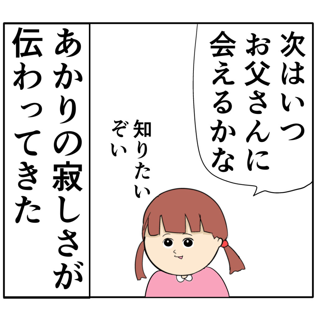 離婚して別居生活になるにあたり仕事や生活面での心配はそれほどしていなかっためいさんですが、お父さんに会えなくなることであかりちゃんが寂しさで精神的ストレスを受けることを心配していました。これまで住んでいた家からめいさんの実家が近かったためあかりちゃんは学校を転校せずに済み、ろみ緒さんとはよく電話で話し、時々会う時間も作っていましたため、離婚後の生活は思っていたよりも順調だと思っていためいさん。しかし、ふとした時にお父さんのことを思い出したり「次はいつ会えるかな」と話すあかりちゃんを見て、やはりあかりちゃんがお父さんと会えない生活に寂しさを感じているのだと痛感するめいさんでした。