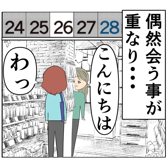 夫の元彼女だとは知らずスーパーでジュリ実さんを調味料コーナーへ案内しためいさんは、数日後にまたジュリ実さんとスーパーで遭遇。「あっこんにちは」「こんにちは。この前はありがとうございます」と軽く挨拶を交わしました。