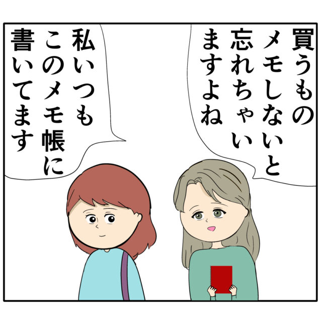 「買うものメモしないと忘れちゃいますよね。私いつもこのメモ帳に書いてます」とメモ帳を見せながらめいさんに話しかけるジュリ実さん。