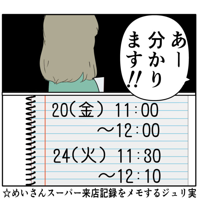 「あー分かります!!」と共感するめいさんですが、ジュリ実さんのメモ帳に書かれていたのは、めいさんが何曜日の何時にスーパーに来ているのかを書き留めたものでした。