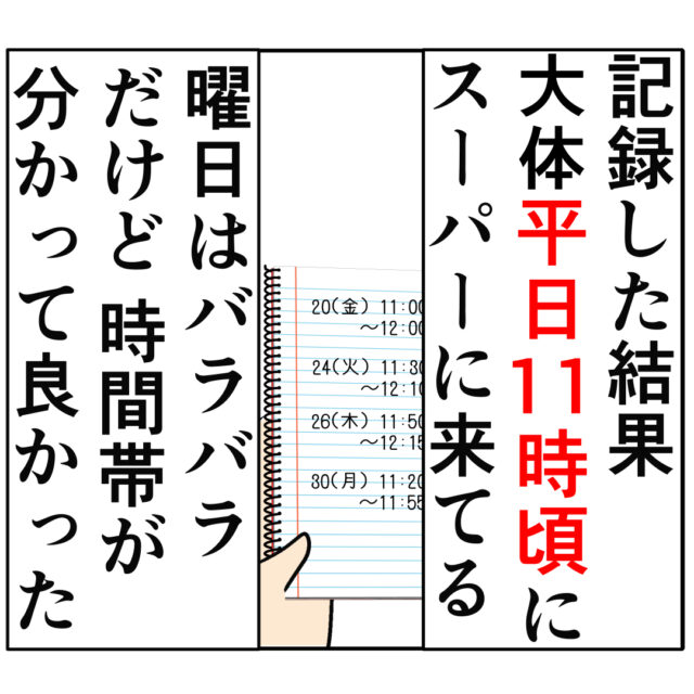 めいさんがいつスーパーに来ているのかを数日間チェックしていたジュリ実さん。記録した結果、曜日はバラバラですが大体平日の11時頃にスーパーに来ていることを把握しました。