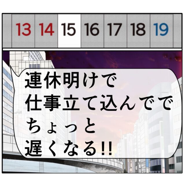 それから数日後の夕方、ろみ緒さんは「連休明けで仕事立て込んでてちょっと遅くなる!!」とめいさんに連絡。