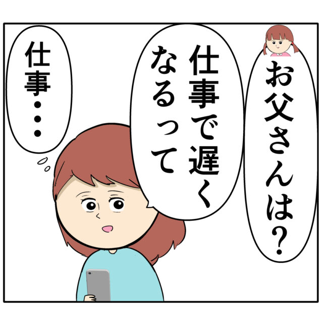 家ではあかりちゃんに「お父さんは?」と聞かれためいさんが「仕事で遅くなるって」と返しながら、心の中では「仕事・・・」と少し違和感を覚えていました。