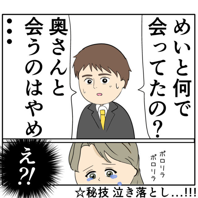 「めいと何で会ってたの?奥さんと会うのはやめ・・・」と言いかけると、突然ジュリ実さんが大粒の涙をはらはらと流し始め、ろみ緒さんは驚きます。