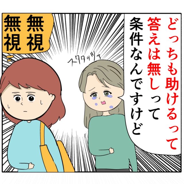 結果を伝えてもまだ「どっちも助けるって答えは無しって条件なんですけど」と、ろみ緒さんへの質問の話をしながらめいさんについてくるジュリ実さんをひたすら無視し続けるめいさんです。