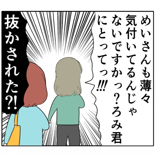 「めいさんも薄々気づいてるんじゃないですか?ろみ君にとって、」と、めいさんの後ろについて歩きながら話していたはずのジュリ実さんは、興奮気味に語りながら勢い余ってめいさんを抜かしてもまだ話していたので、抜かされた?!と一瞬不思議に思っためいさんです。