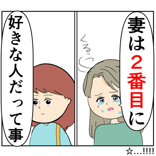 するとジュリ実さんは突然くるっと振り向き、めいさんの正面に立ちはだかると、話の続き「妻は2番目に好きな人だって事」と、決まった!と言わんばかりの顔で言い放ちました。