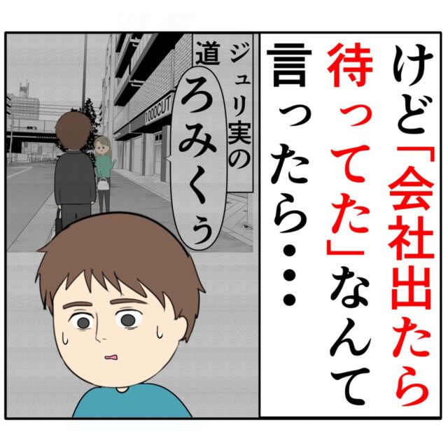 事実をそのまま話したい気持ちもありつつ、「けど『会社出たら待ってた』なんて言ったら・・・」という考えが浮かび、昨日ジュリ実さんが待ち伏せしていたことは話さない方がいいと判断したろみ緒さん。