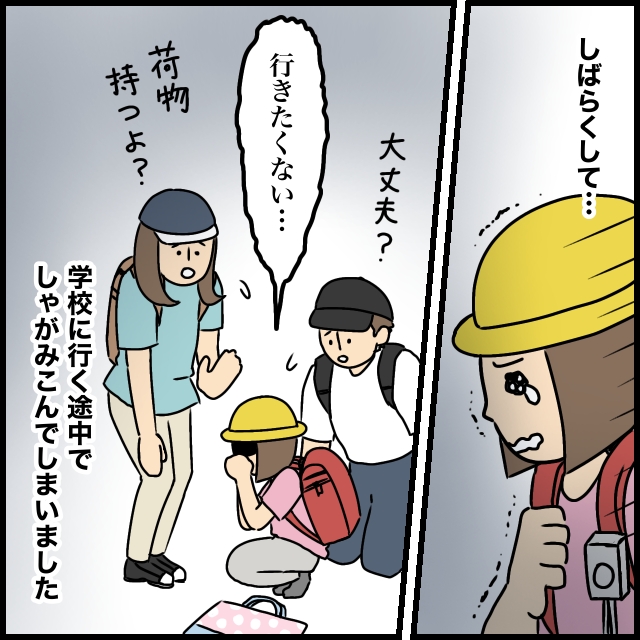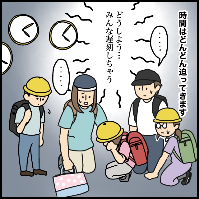 なかなか泣き止まない女の子。登校途中なので、学校まではまだ少し歩かなければなりません。女の子を励ましているうちに時間はどんどん迫ってきて、娘は心の中で(どうしよう、みんな遅刻しちゃう)と焦っていました。