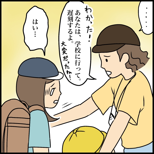 途中、先に学校へ行った同じ班の子たちから事情を聞いて女の子を迎えに行こうとしている先生とすれ違った娘。先生は焦った表情で懸命に走る娘を見て「ありがとね。担任の先生には伝えてあるから学校に行って。急がなくていいよ!」と言ってくれ、娘はようやく安心することができたのでした。