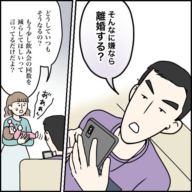 夫タカシは、スマホから目をそらさず、無表情で「そんなに嫌なら離婚する?」といつものように言いました。呼び出されるとすぐに飲み会に出かけていく夫に、もう少し参加する回数を減らしてほしいとお願いしただけなのに。泣き止まない娘モモをあやしながらもタカシとちゃんと話したい私ですが、タカシは誰かに返信しながらまるで気にしていない様子。きっと今日も行くんだね。