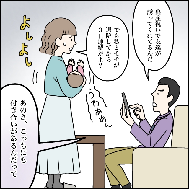 私は初めての子モモを出産し、まだ退院してきたばかり。タカシは出産祝いで友達が誘ってくれていると言いますが、もう3日連続です。モモのお世話だってまだ新米ママの私は手探りだし、産後で体もまだまだしんどいのに「こっちにも付き合いがある」って。