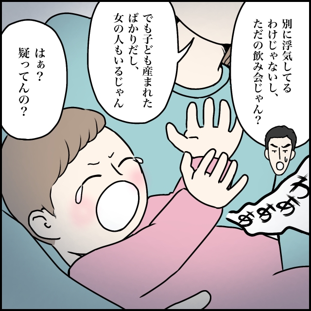 友達が祝ってくれるのは有難いことかもしれないけど、娘を迎えて嬉しくないのかな。「別に浮気してるわけじゃないし、ただの飲み会じゃん?」とイラつくタカシに、子どもが産まれたばかりなのに、女の人もいる飲み会に夜な夜な出かけていくことに苦言を呈すると、さらにイラつかれてしまいました。