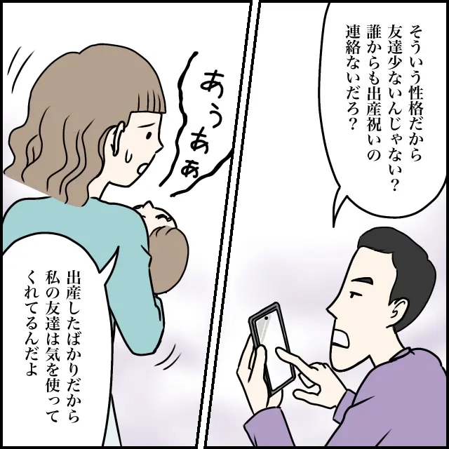夫が友達と出かけることを嫉妬したり束縛して文句を言っているかのように、私の性格を指摘するタカシ。だから友達少ないとか、誰からも出産祝いの連絡がないとか言われてしまいました。私の友達には既婚者もいて出産したばかりの私を気遣ってくれているだけだと説明しても全く聞いていません。