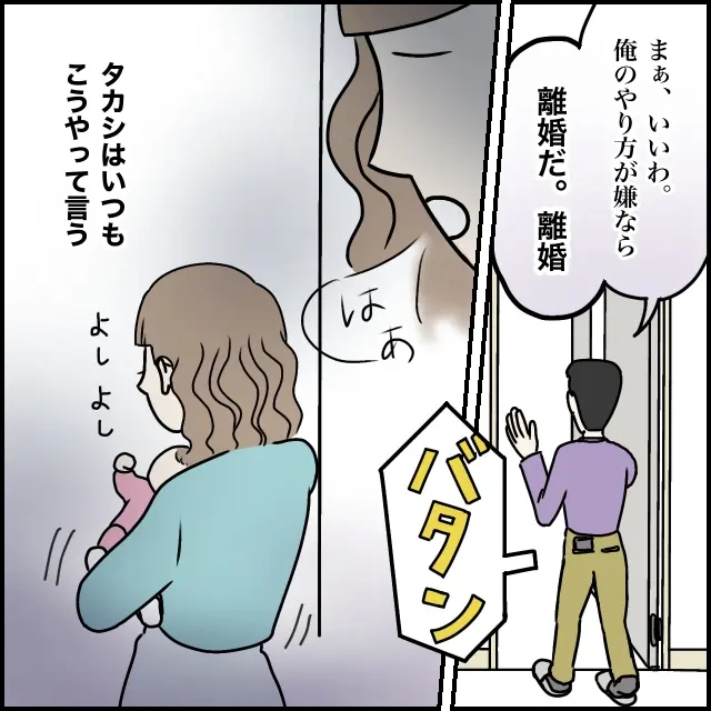 タカシへの訴えも空しく、タカシは「俺のやり方が嫌なら離婚だ、離婚」と言いながらやはりこの日も飲み会へ出かけてしまいました。またいつものパターン。私は大きくため息をつきました。