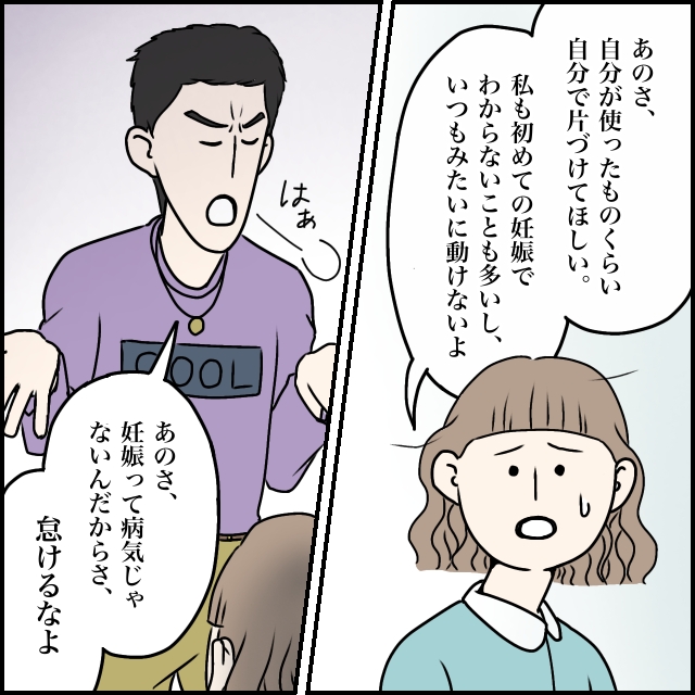 私はタカシに協力してもらいたい一心で、「あのさ、自分が使ったものくらい自分で片付けてほしい、私も初めての妊娠でわからないことも多いし、いつもみたいに動けないよ」と伝えました。そんな私を見てタカシはやれやれとため息をつくと「あのさ、妊娠って病気じゃないんだからさ、怠けるなよ」と冷たく言い放ちました。