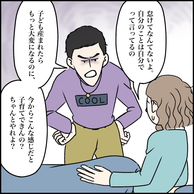 「怠けてなんてないよ、自分のことは自分でって言ってるの」そう必死に伝えたものの、タカシは反論を認めないという態度で「子ども産まれたらもっと大変になるのに、今からこんな感じだと子育てできんの?ちゃんとやれよ?」と言いました。