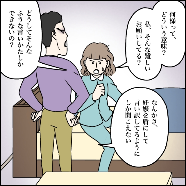 「何様って、どういう意味?私、そんな難しいお願いしてる?」我慢できずにそう言うと、「なんかさ、妊娠を盾にして言い訳してるようにしか聞こえない」タカシにそう言われ、「どうしてそんなふうな言い方しかできないの?」と声を荒げると、